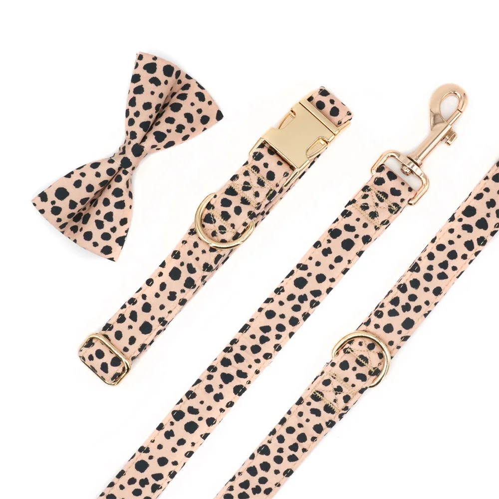 leopard dog collar bow and leash set for big and small dog cotton fabric collar rose gold metal buckle